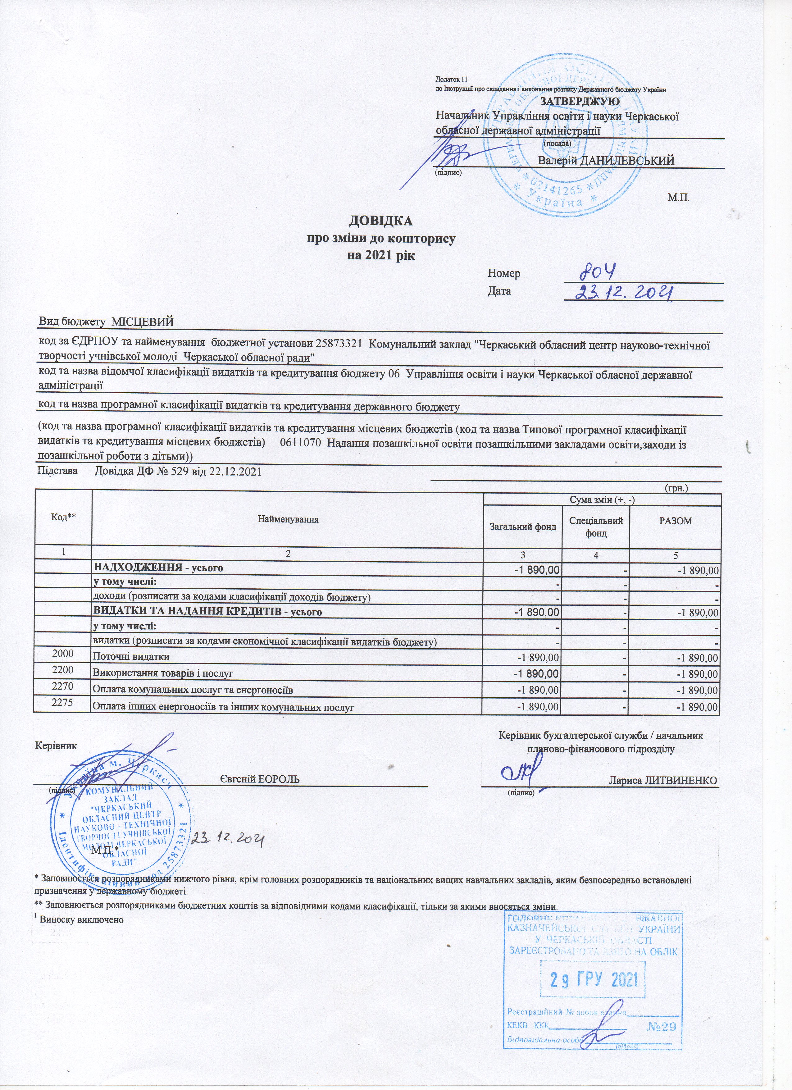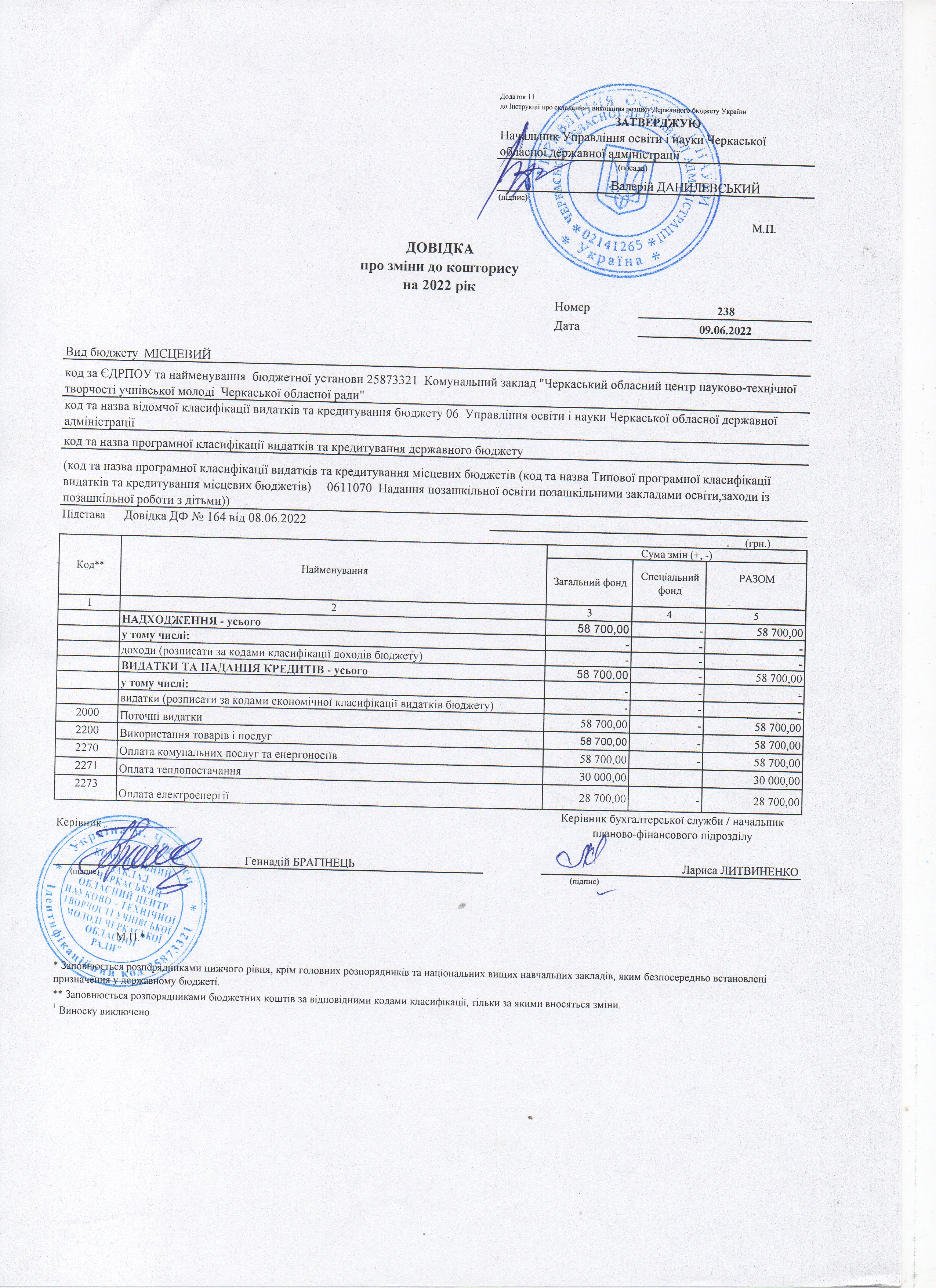 Довідка про зміни до кошторису