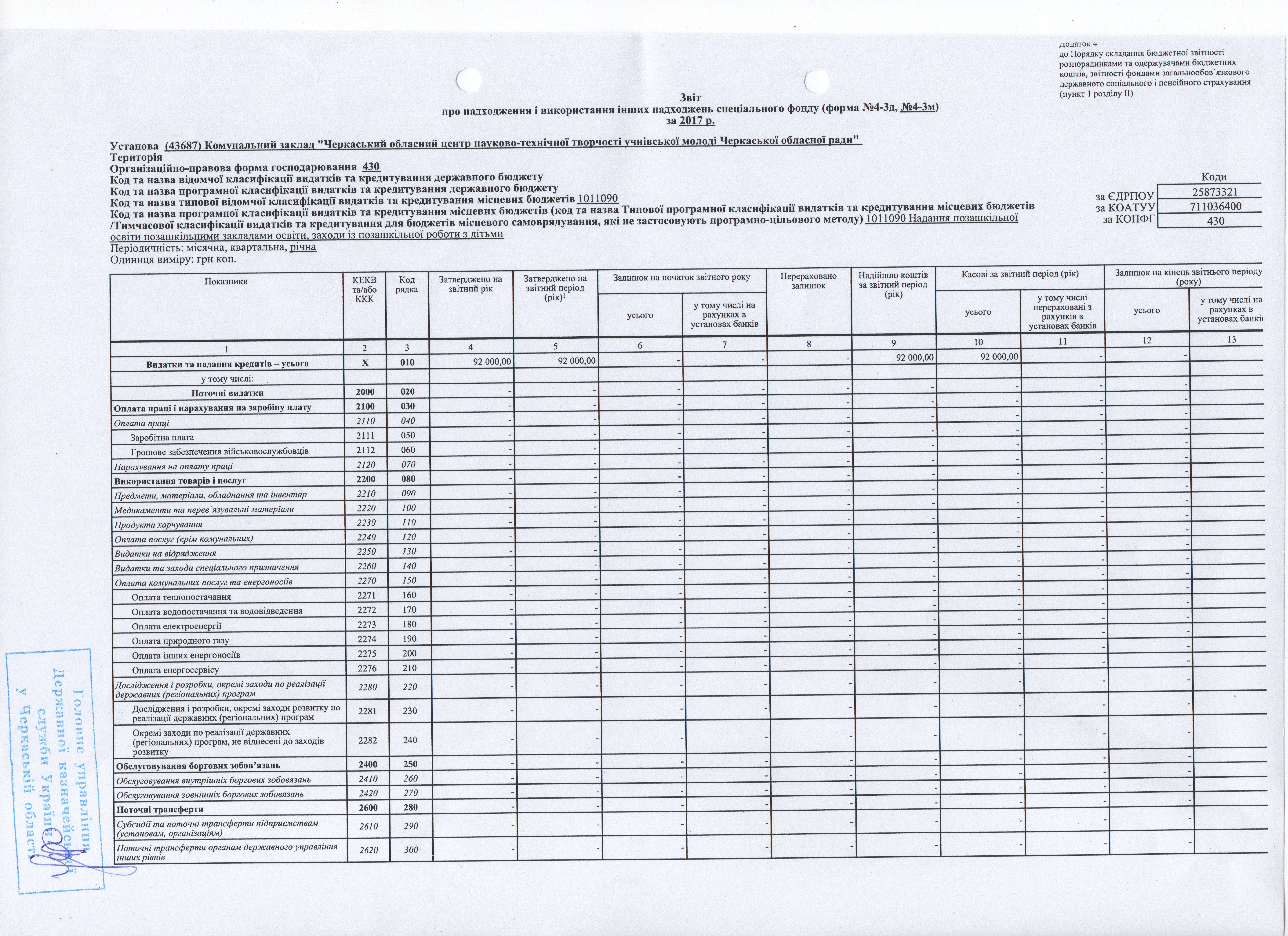Звіт про надходження і використання коштів, отриманих за іншими джерелами власних надходжень за ІІІ квартал 2017 року