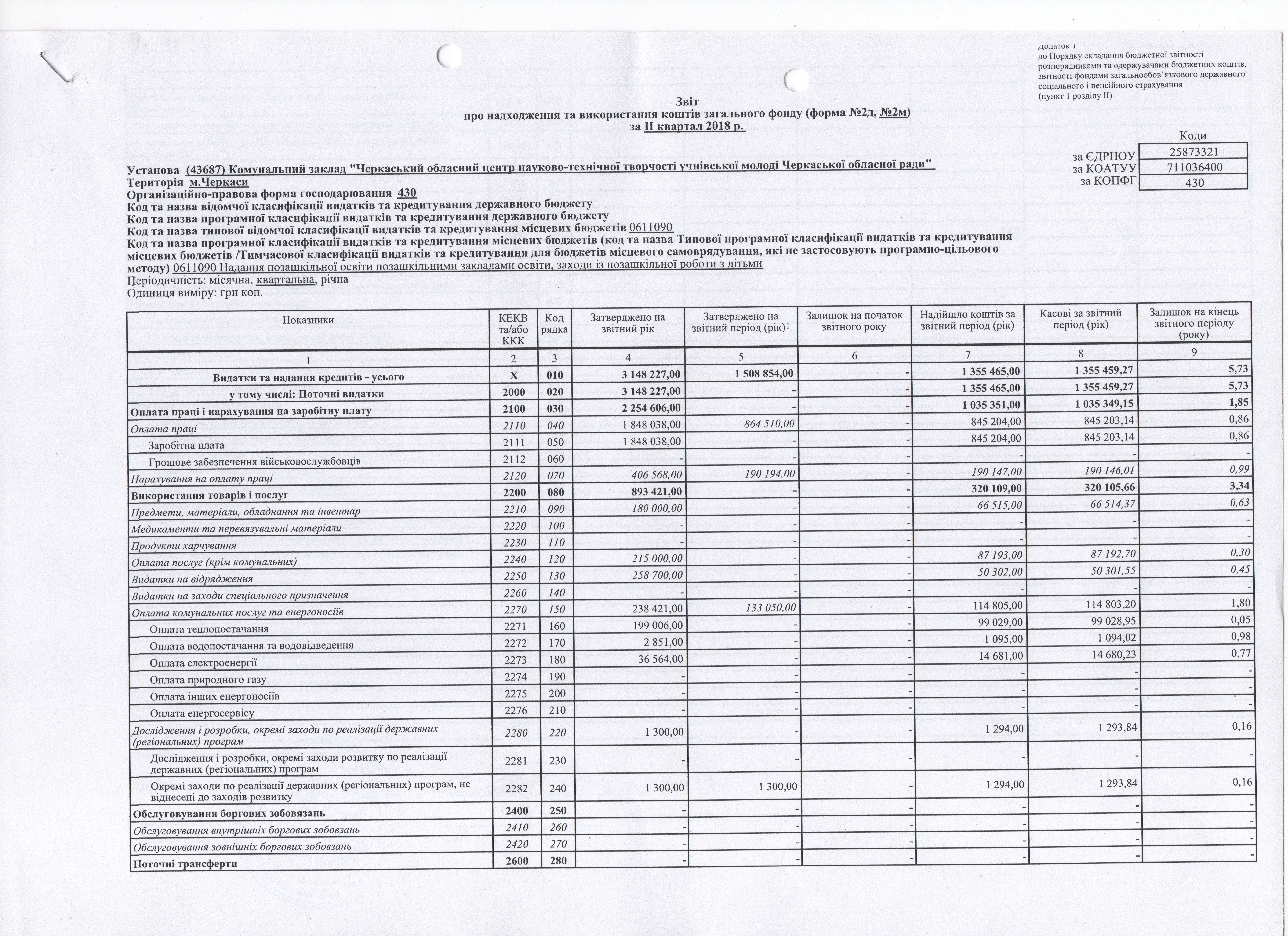 Звіт про надходження та використання коштів загального фонду за ІІ квартал 2018 р.