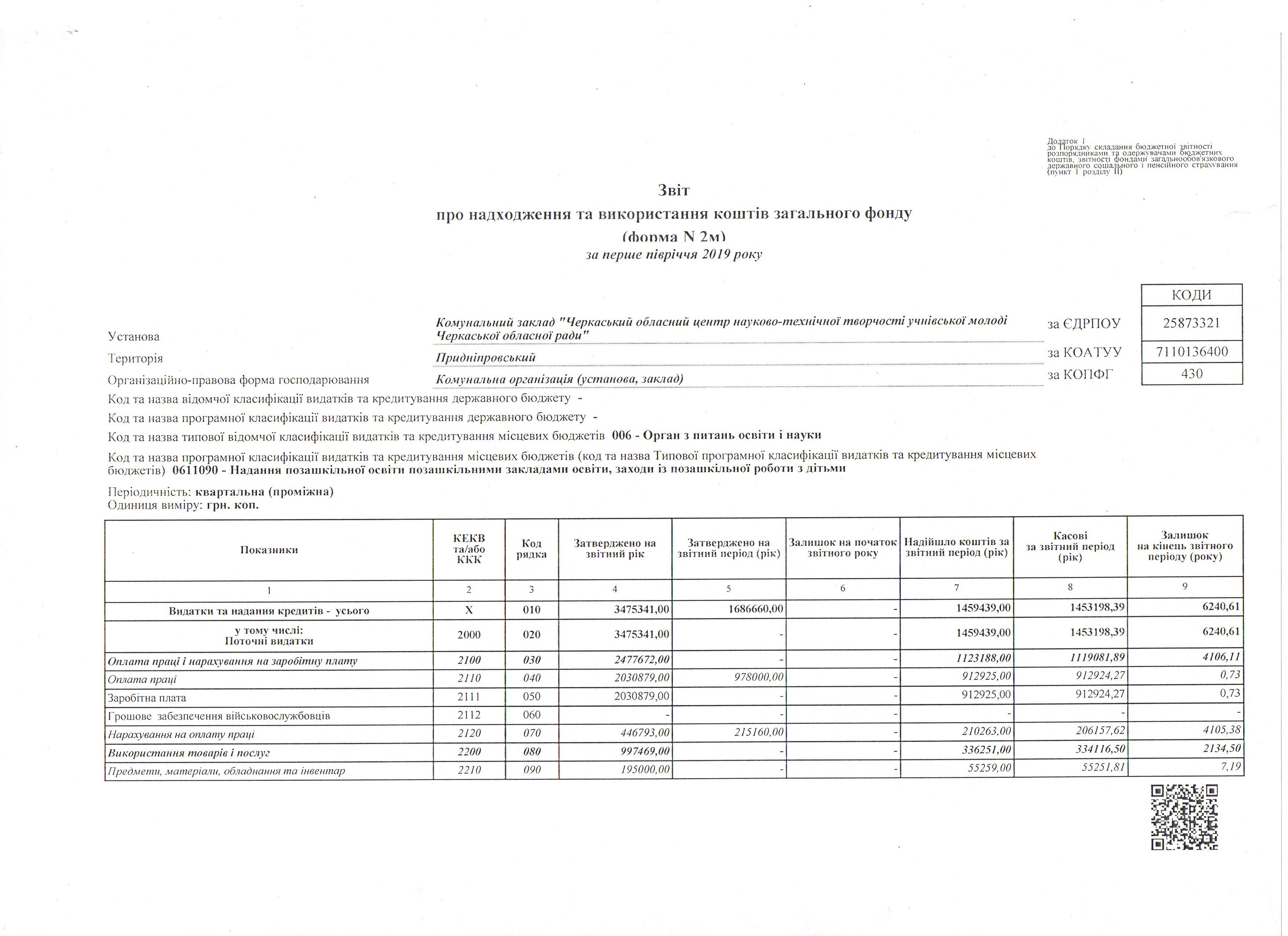 Звіт про надходження та використання коштів загального фонду (форма N 2м) за перше півріччя 2019р