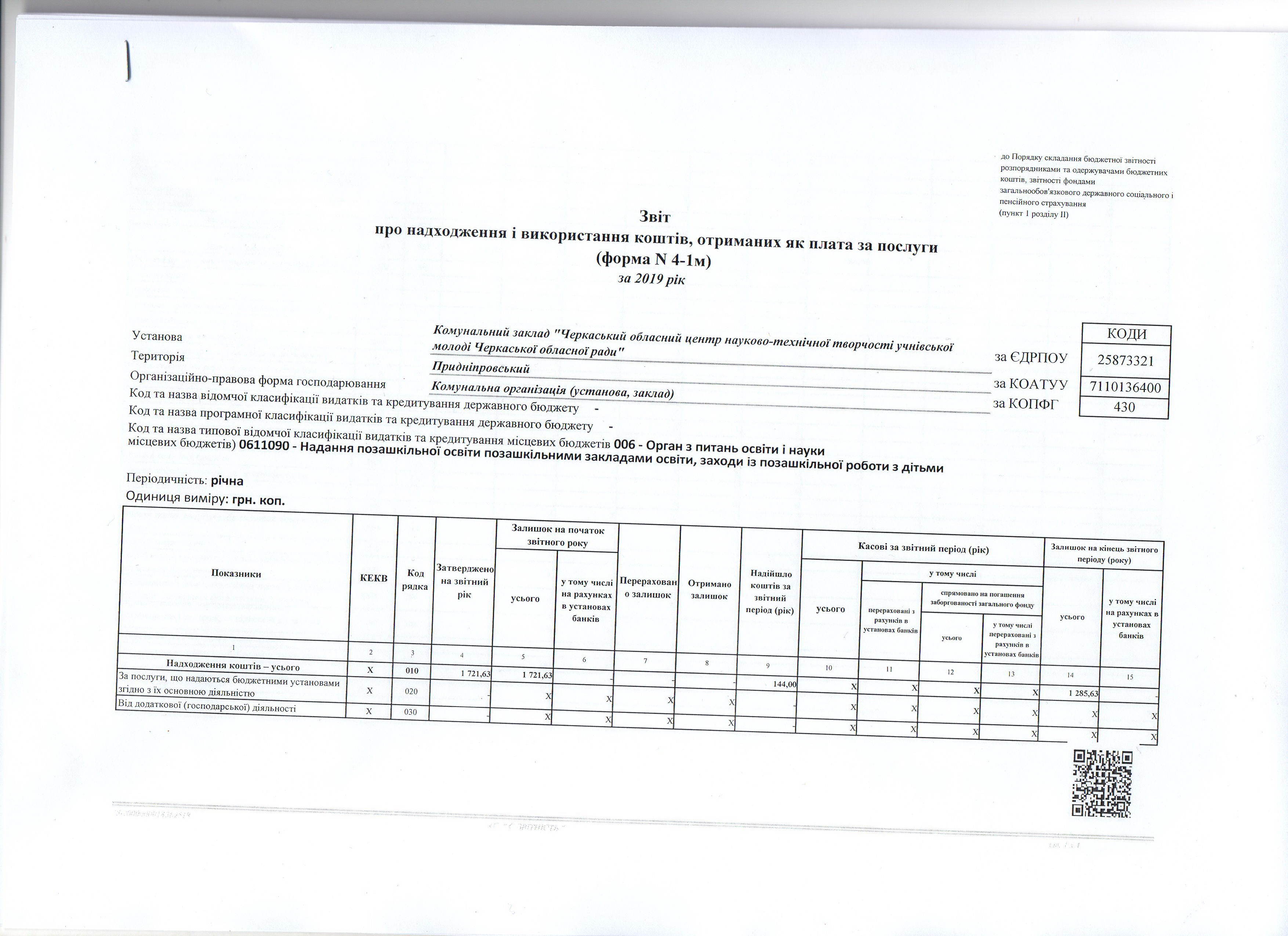 Звіт про надходження коштів, отриманих як плата за послуги (форма N4-1м) за 2019 рік