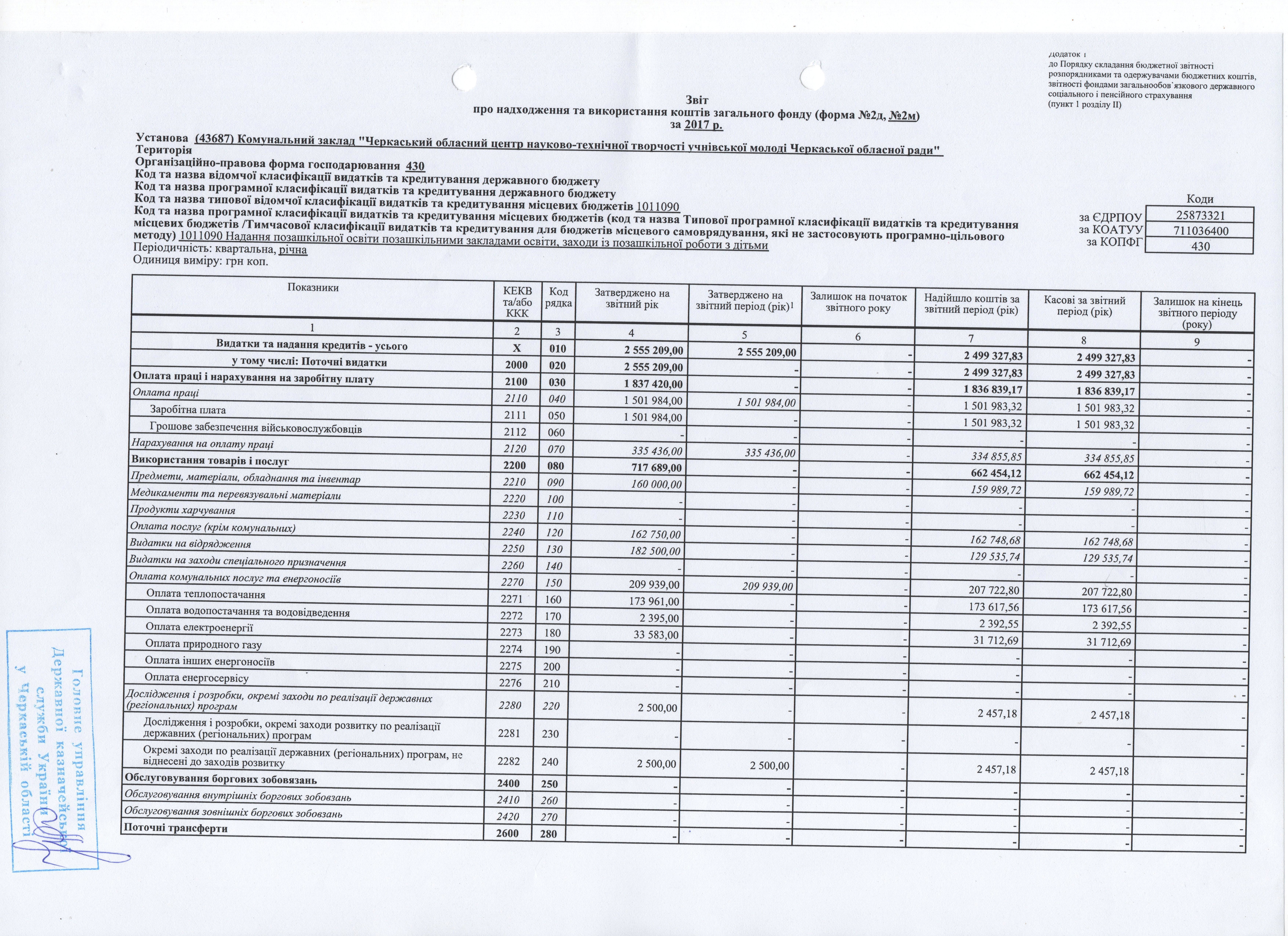 Звіт про надходження та використання коштів загального фонду квартал 2017 року